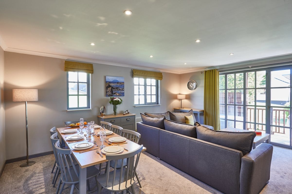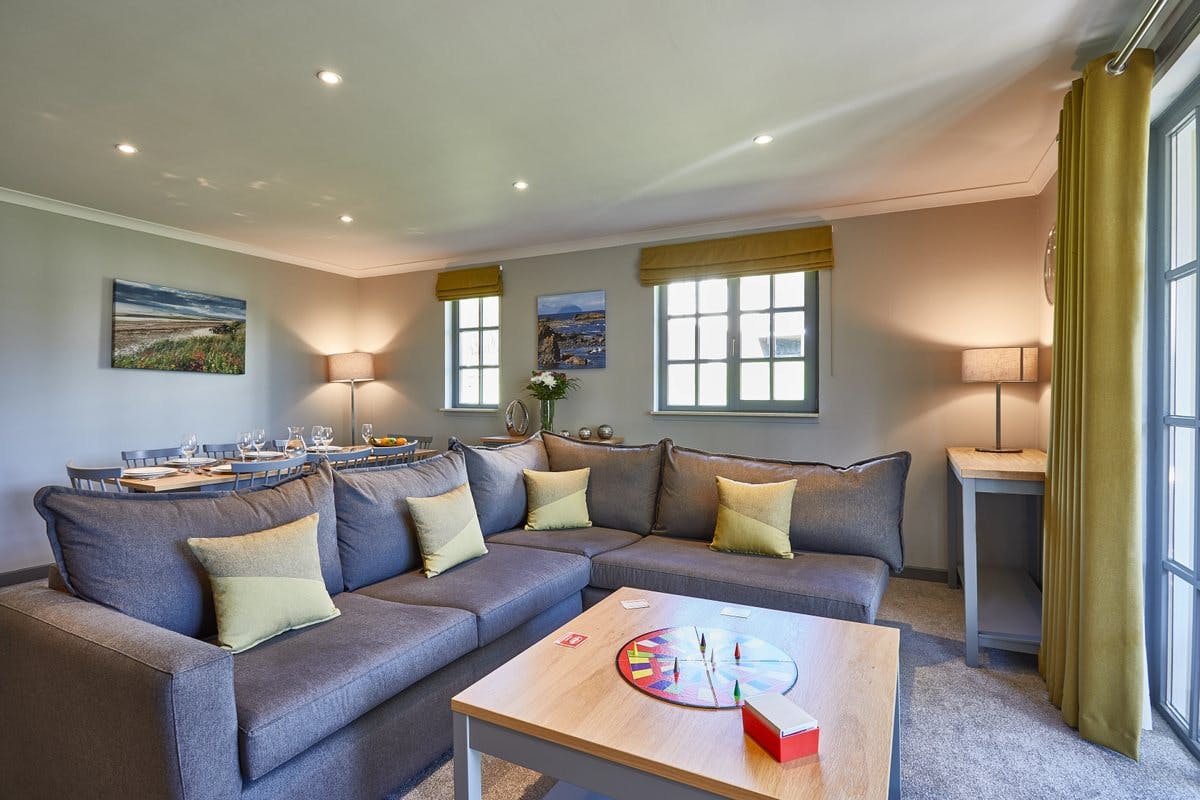 The Brunston Lodge offers spacious three bedroom accommodation with flexible living space, making it particularly appealing for families and longer stays. A bright open-plan living area opens onto a private decking or veranda area, creating a relaxed, year-round living environment.